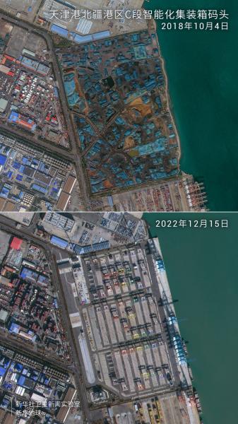 图为卫星拍摄的天津港北疆港区C段智能化集装箱码头前后对比图。