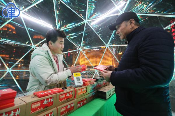 在古文化街古典建筑及海河沿岸现代景致的映衬下,天津分会场将游船码头、海河夜景与古文化街宫前广场、戏楼有机融合,给人以传统与现代,古老与时尚的穿越感。亲水平台现场设置的10余个星空泡泡屋,将海河点缀的跳脱灵动,泡泡屋内集中展示了本市非遗老字号伴手礼和运动体育、智慧家居等产品;古文化街宫前广场打造非遗市集,现场设置了十几辆花车,游客及古装演员穿梭其中,重现津沽码头舟车汇集、商贾云集的繁华景象。
