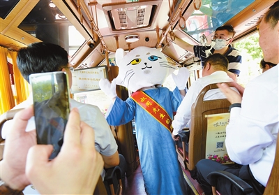 “津遇大师”号主题铛铛车沿途经过我市代表性的“网红打卡地”。图为景点工作人员登车表演节目。 本报记者 张磊 摄