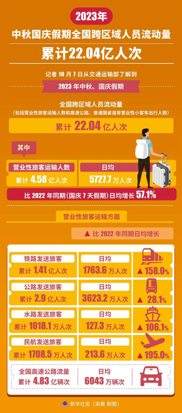 内容提要:记者7日从交通运输部了解到,2023年中秋、国庆假期,全国跨区域人员流动量(包括营业性旅客运输人数和高速公路、普通国省道非营业性小客车出行人数)累计22.04亿人次。其中,营业性旅客运输人数累计4.58亿人次,日均5727.7万人次,比2022年同期(国庆7天假期)日均增长57.1%。