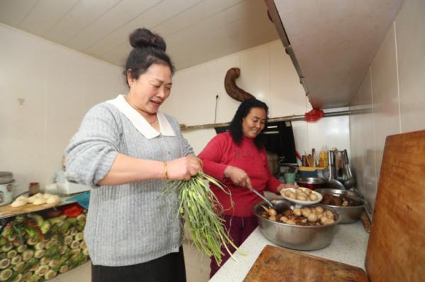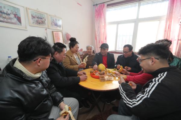村民尹芹侠早在腊月二十八那天就发好了面,蒸了一锅豆沙馒头。亲家郝健与张凤文两口子在蔬菜大棚里忙到年根儿,过年前后才能歇两天,尹芹侠就主动邀请亲家来吃团圆饭,她笑着说:“自从儿女结亲,两家人就开始在一起过年,人多热闹!”