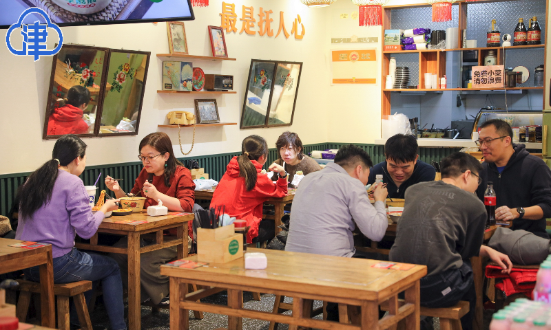年夜饭、特色津菜、自助烤肉、海鲜……各类美食轮番上阵。众多网红美食打卡地销售火爆。煎饼果子、熟梨糕、大麻花、商场、小吃街,热闹的烟火气,将年味拉满。