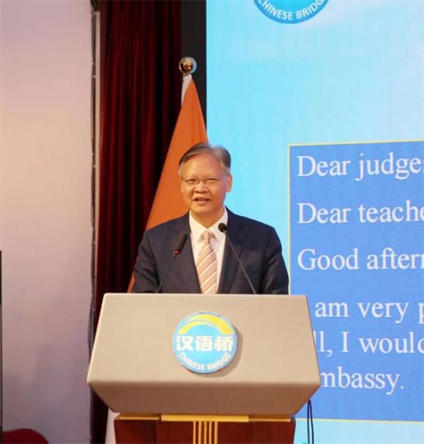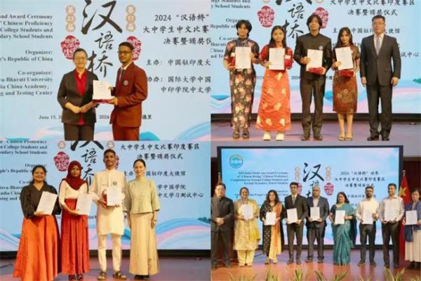 2024“汉语桥”世界大中学生中文比赛印度赛区决赛暨颁奖仪式在新德里举办。中国驻印度大使徐飞洪出席并讲话。印度杜恩大学校长苏雷卡·丹格瓦尔教授,泰戈尔国际学校校长马利卡·普雷曼,汉学家、国际大学中国学院院长阿维杰特·班纳吉教授,印中友协德里秘书长帕文·古普塔博士,印度中国商会会长蒋国兵出席活动并发言。驻印度使馆马珈公使、王新明公参、杨修华参赞和决赛选手、印度16所大学中文专业负责人、本土中文骨干教师、德里地区部分院校师生、中资企业代表及各界友人等100余人参加活动。现场同时举办“纪念泰戈尔访华100周年图片展”,徐飞洪大使为展览揭幕。
