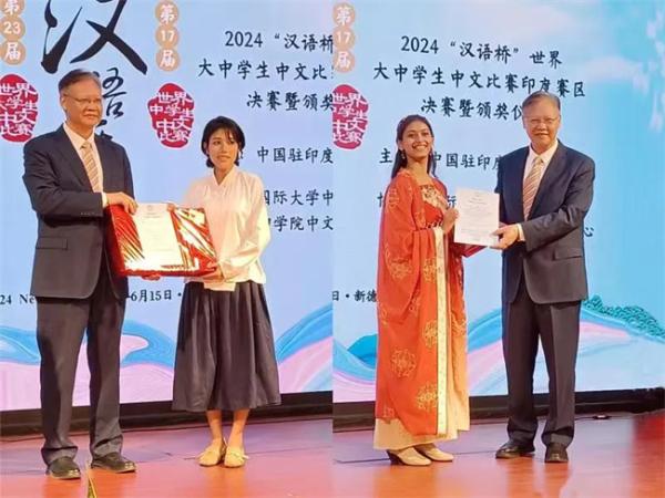 本届“汉语桥”大中学生中文比赛吸引印度20多所大中学校近60名学生参赛,经过层层选拔及预赛,7名大学生、6名中学生入围决赛。决赛现场,经过中文演讲、才艺展示和知识问答竞赛,来自曼尼普尔邦达纳曼朱里大学的唐艺楠获得大学组冠军、马邦浦那圣米拉学校的孔昭怡获得中学组一等奖。