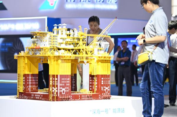 7月12日,与会者在航运展上参观“深海一号”能源站模型。新华社记者 李然 摄