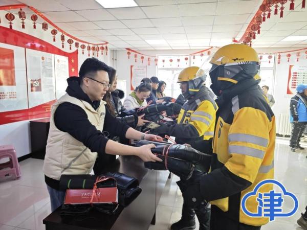 在活动中,红桥区总工会与红桥区司法局为每一名外卖小哥精心准备了一份包含宪法、民法典、劳动法以及道路交通安全法等法律法规的宣传手册,以及保温杯、护膝、手套等防寒物资,在寒冷的冬季中保障骑手们的配送安全。