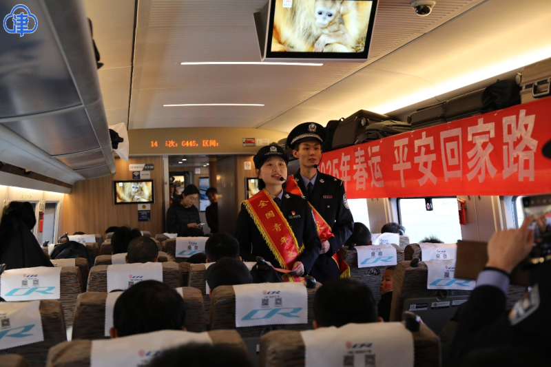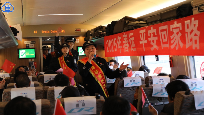 1月14日是春运开始的第一天,为了营造春运温馨、热闹的出行氛围,让旅客平安回家、过团圆年,天津铁路公安处民警登上G448/5次列车,开展了以“2025春运平安回家路”为主题的春运宣传活动,与旅客开心互动,为旅客送上祝福和温暖。