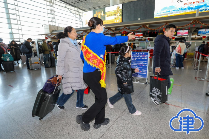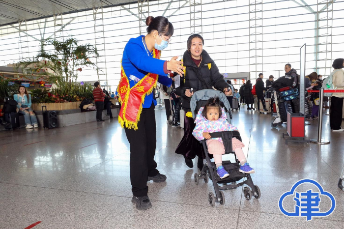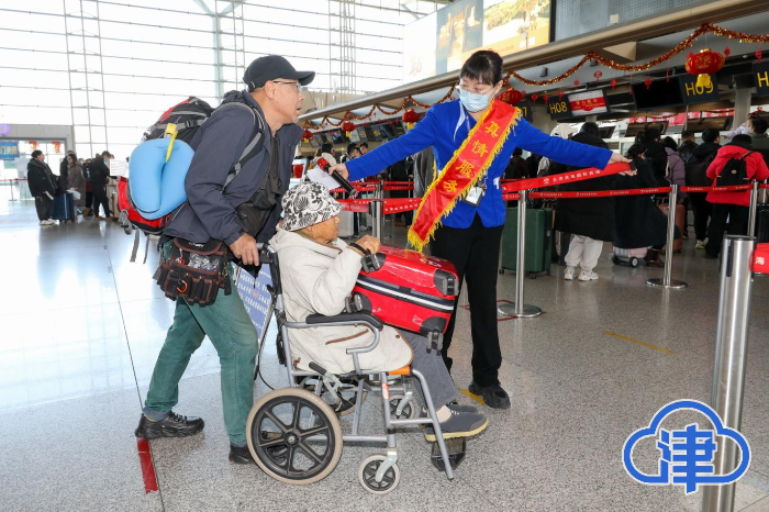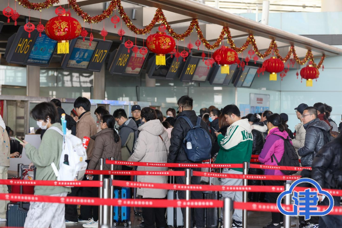 1月22日,正值小年,天津滨海机场呈现出一片繁忙热闹的景象。航站楼内人潮涌动,旅客们手提肩扛着大包小包的行李,脸上洋溢着即将回家过年的喜悦。值机柜台前,工作人员们有条不紊地为旅客办理手续,耐心细致地解答着各种问题。