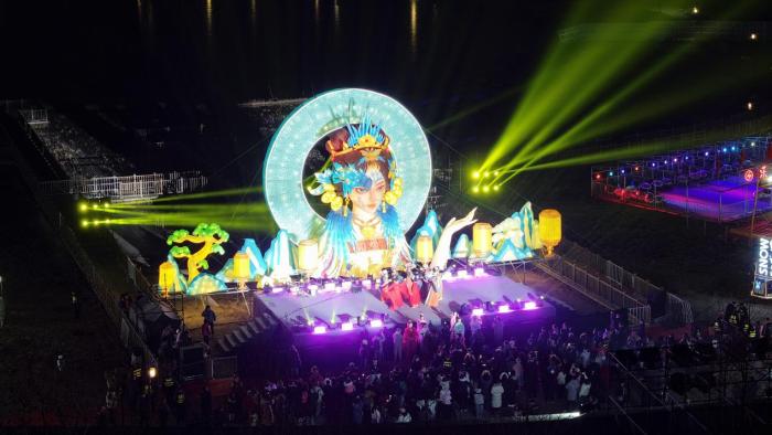 说起今年灯展的亮点,不得不提到“创世女神”主灯,它以花灯技艺再现中国古典神话中万物之母——女娲炼石补天、抟土造人的英姿,恢宏大气,流光溢彩,尽显创世女神的威严。