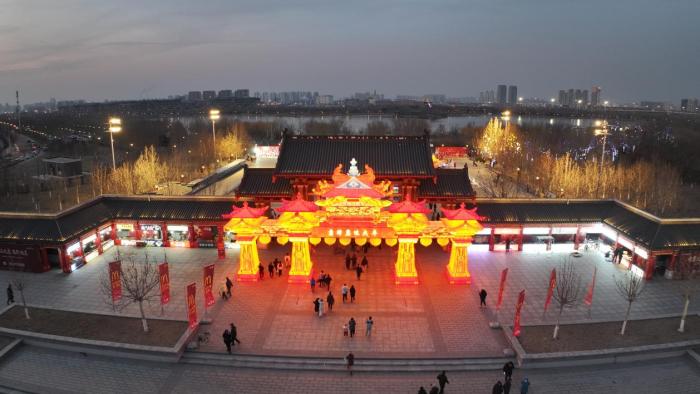 “星宿千灯”主题灯组由天之四灵,即青龙、白虎、朱雀、玄武四大灵兽组成,守护人间安宁,闪耀的黄金祈愿树矗立在侧。山海秘境主题灯组由山海经中的奇珍异兽组成,“夔牛除祟”扫去旧年尘埃,“文鳐送春”带来新春祝福,“琪花玉树”展望多彩愿景,“万象更新”收获喜悦与吉祥;“城就精彩”主题灯组由天津代表性的建筑与特色美食组成,配合《冠绝津门》的津味演出,展现天津的城市魅力与人文风情。