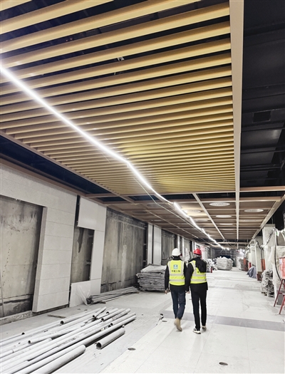 为了加速推进工程进度,车站建设与装饰装修工作同步进行。记者看到,在位于地下一层的站厅层,已经有部分区域做出了装修效果。车站的设计灵感源自明清时期的传统建筑,顶面采用了中式传统藻井设计,色彩上融合了木色、灰色和白色,使地面的仿古建筑与地下车站空间和谐统一。站内突出梁、柱关系,用简化的中式结构展现了仿古建筑特有的古朴典雅与诗情画意,使乘客沉浸在传承千年的东方之美。鼓楼站的西侧就是南开大悦城,东侧将会建设海信广场,未来乘客可以通过地铁的地下通道,穿梭于这两座商场。