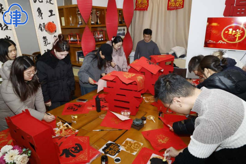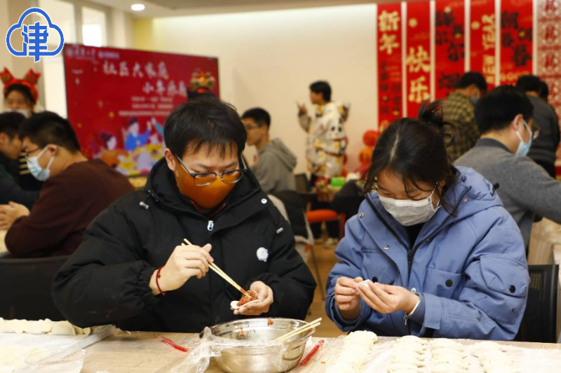 天津北方网讯:随着农历春节的脚步越来越近,津城的年味也越来越足。近日,在天津大学北洋园“一站式”学生社区,暖意融融的室内张灯结彩,天津特色吊钱儿、拉花、福字等营造出浓厚的节日氛围,糖瓜、水果、干果、饮料等摆放整齐。学校留校师生们和领导干部职工共聚一堂,一起包饺子、摇元宵、剪窗花、拓年画、写福字,欢声笑语不断。