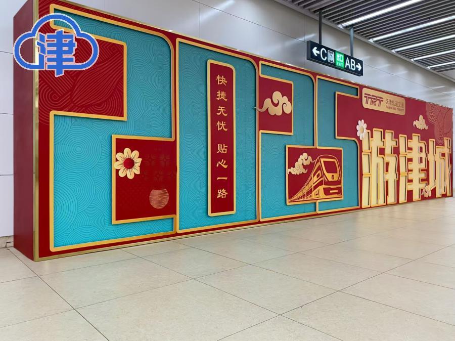 这两天,由天津师范大学美术与设计学院师生团队携手天津轨道交通集团打造的2025年春运站区主题设计,陆续在天津站站、西站站、天津宾馆站、文化中心站等地铁站内亮相,喜庆的装饰布置、造型别致的氛围打卡点等吸引了不少过往旅客的目光。这是双方共同开启产教融合、校企合作的新实践,通过82个“天津欢迎您”等主题挂旗和包柱,以及7组包括剪纸等非遗元素、古文化街牌楼等天津地标建筑元素、“福”字和大红灯笼等春节文化元素的氛围景观设计,为春运增添“年味儿”,让旅客在出行中感受津城文化魅力。