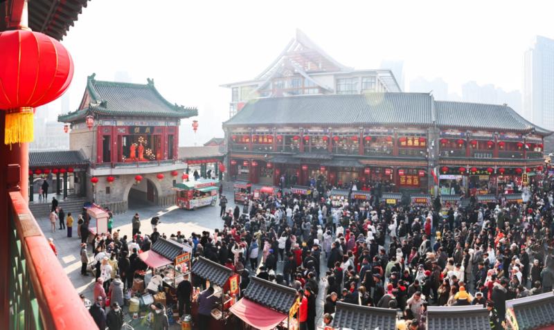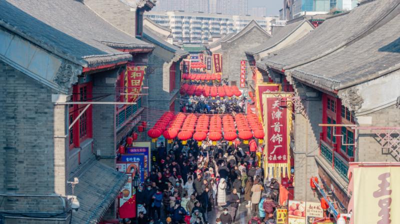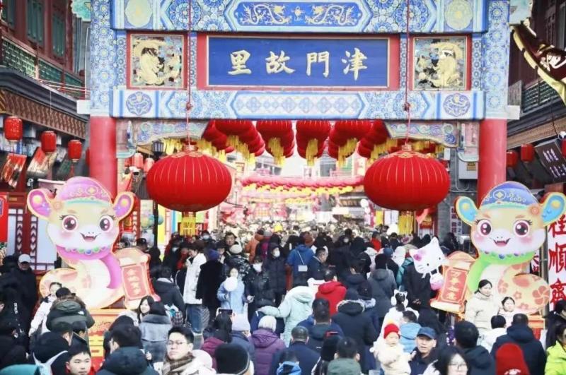 合家团聚到山村民宿过大年成为春节假日的一大特色,蓟州区民宿接待量和收入分别同比增长71.4%和98.7%。购年货、吃年饭、度年假,文旅商消费市场迎来“开门红”。全市各大年集拢聚了浓浓的烟火气,各集市摊位前人流涌动,热闹非凡,让市民“一站式”购齐年货好物。市民游客穿梭于天津的大街小巷和商业街区,在西北角、中山美食街、和平路美食街尝遍津味。河西区万象城、河东区爱琴海购物中心、武清区佛罗伦萨小镇等商贸综合体不仅推出形式多样的促销活动,还带来舞龙舞狮、乐队表演等春节特色演出,丰富市民游客休闲购物体验。