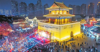 2月9日上午,艳阳高照,记者来到天津鼓楼新春灯会,尽管是白天,景区内已有不少外地游客漫步游览。多名游客表示,他们计划夜游鼓楼灯会,因为这里不仅有精美的花灯,更有沉浸式演艺,围绕鼓楼建筑本体,呈现富有仪式感的文化演出,讲述城市历史和天津文化,丰富游客体验。(记者 吕献峰 胡凌云 摄)