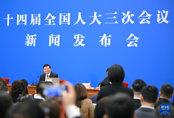 3月4日,十四届全国人大三次会议在北京人民大会堂举行新闻发布会。大会发言人娄勤俭就大会议程和人大工作相关问题回答中外记者提问。新华社记者 胥冰洁 摄