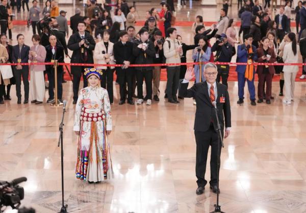 3月5日,第十四届全国人民代表大会第三次会议首场“代表通道”集中采访活动在北京人民大会堂举行。新华社记者 郑焕松 摄