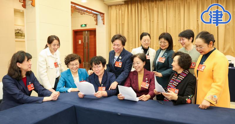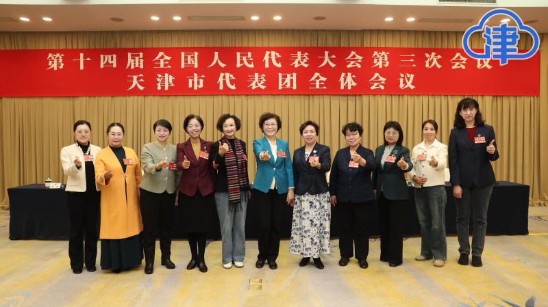出席十四届全国人大三次会议的天津代表团女代表们在会议间隔热烈交流。(摄影 津云新闻记者 马成)