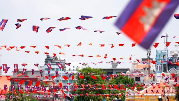 金边街头悬挂的中柬两国国旗。(总台央视记者卢心雨拍摄)