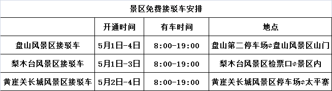 盘山风景区接驳车:5月1日—4日,8:00—19:00,盘山第二停车场?盘山风景区山门;
