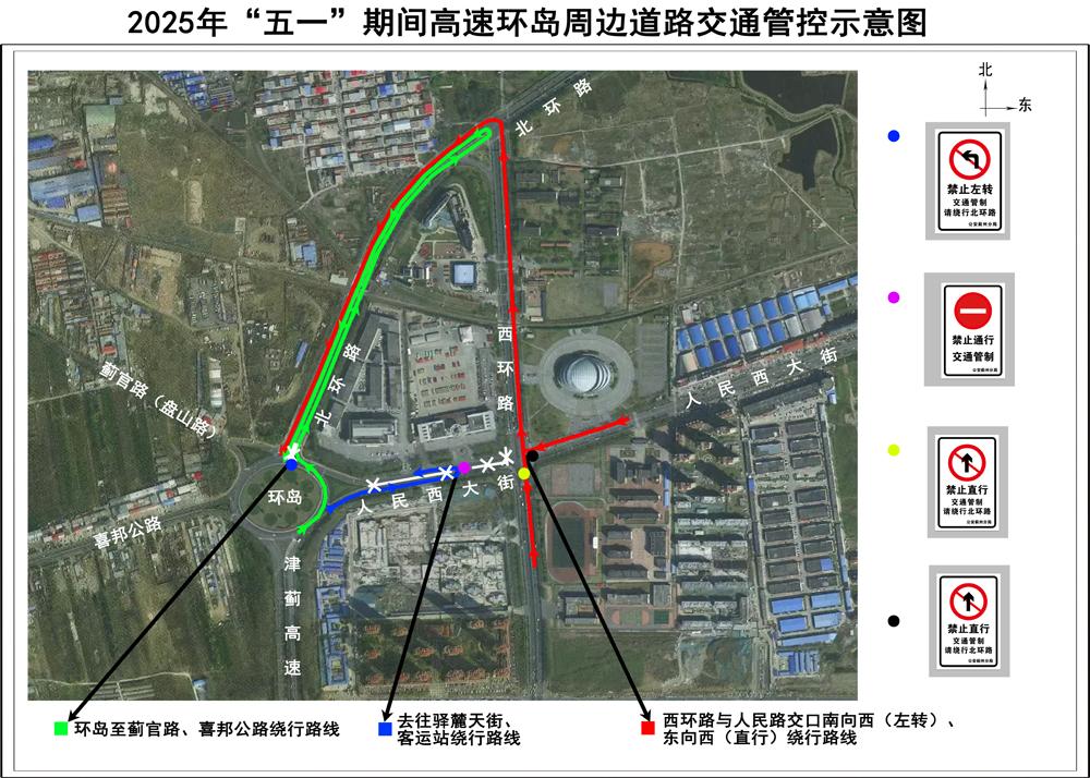 沿津蓟高速由南向北进入环岛向蓟官路(盘山路)、邦均方向行驶的车辆,均需由北环路绕行至西环路交叉口,调头行驶至环岛西侧通行;