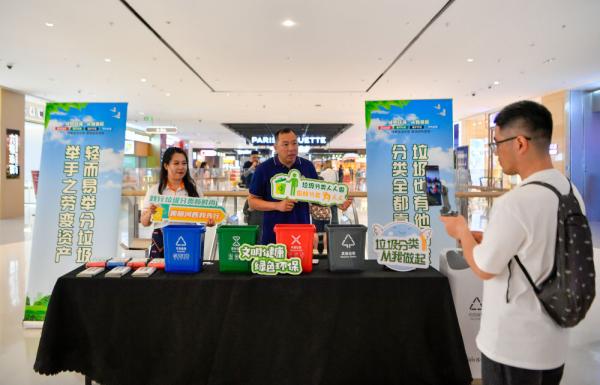 2023年,在天津梅江环宇城,天津市河西区城管委工作人员与志愿者进行垃圾分类科普宣讲直播。新华社记者 孙凡越 摄