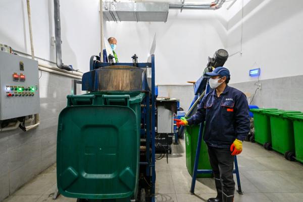 2023年5月26日,在天津梅江环宇城,工作人员操作设备对已进行垃圾分类的厨余垃圾进行处理。新华社记者 孙凡越 摄