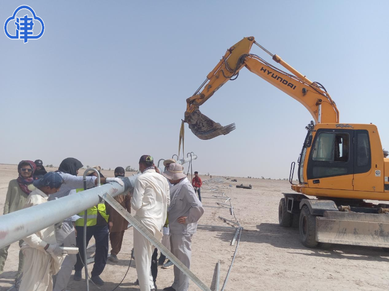 “项目所在地是当地的县城周边,我们从巴基斯坦首都开了8个小时车到那边,一下车就感觉热浪来袭。”第一天到项目所在地,郑龙看到地表都是黄色沙土,几乎没什么植物,而且现场也没有规划好的道路,就是一片荒地,“我们需要做的是先规划项目地的道路,然后再找滴灌、喷灌设备的定位,才能去进行后续设备的安装。”
