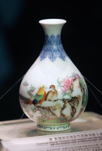 清《乾隆款珐琅彩芍药雉鸡图玉壶春瓶》(天津日报记者 姚文生 摄)