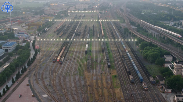 8月12日,“沿着班列看上合”记者一行来到位于天津市北辰区的南仓站。在场站内,仰头可见纵横交错的接触网,这是用来向电力机车供电的特殊系统。我们跟随的中欧(中亚)班列计划在这里停留,将内燃机车头更换为电力机车头,重“头”出发。