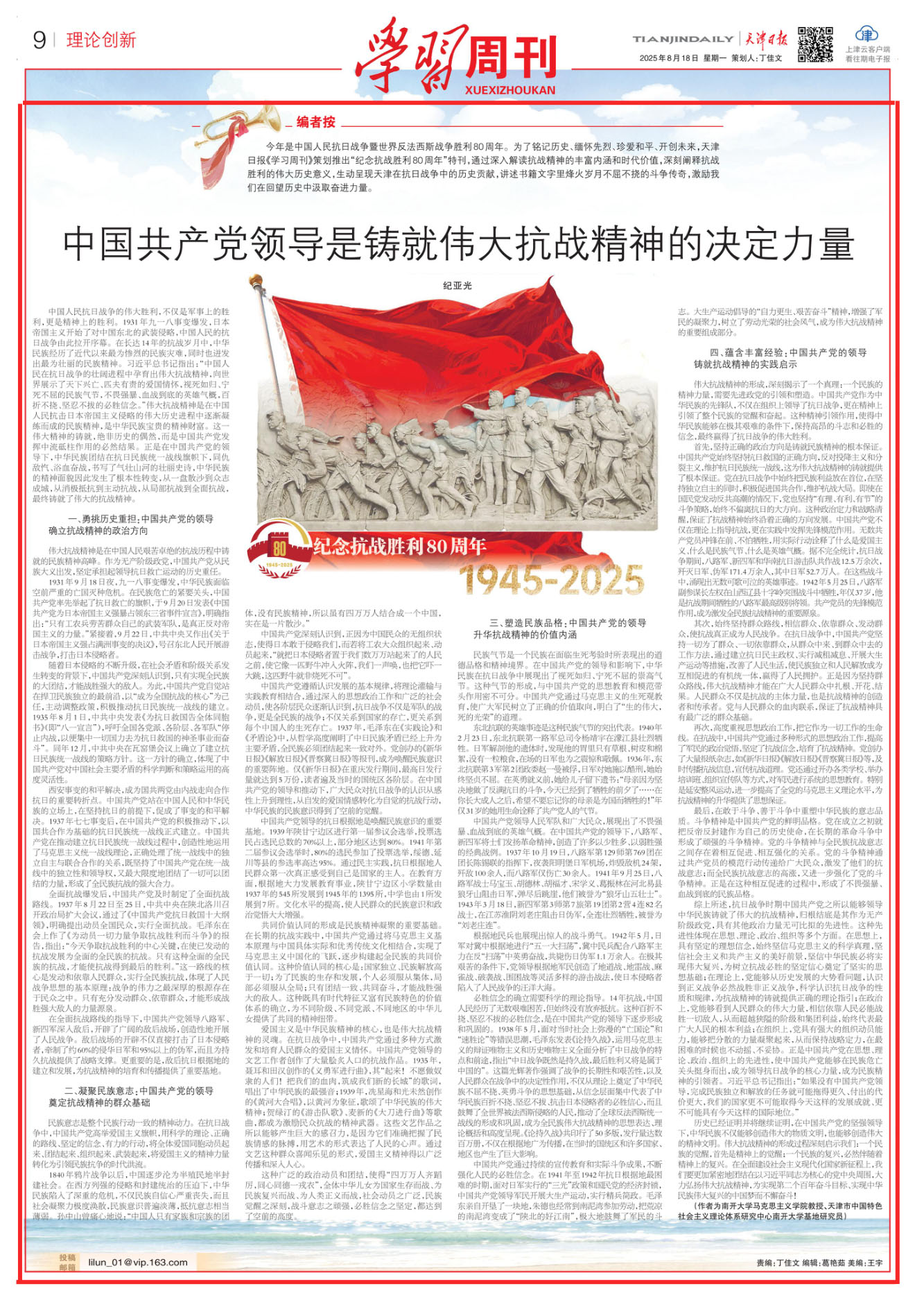 今年是中国人民抗日战争暨世界反法西斯战争胜利80周年。为了铭记历史、缅怀先烈、珍爱和平、开创未来,天津日报《学习周刊》策划推出“纪念抗战胜利80周年”特刊,通过深入解读抗战精神的丰富内涵和时代价值,深刻阐释抗战胜利的伟大历史意义,生动呈现天津在抗日战争中的历史贡献,讲述书籍文字里烽火岁月不屈不挠的斗争传奇,激励我们在回望历史中汲取奋进力量。