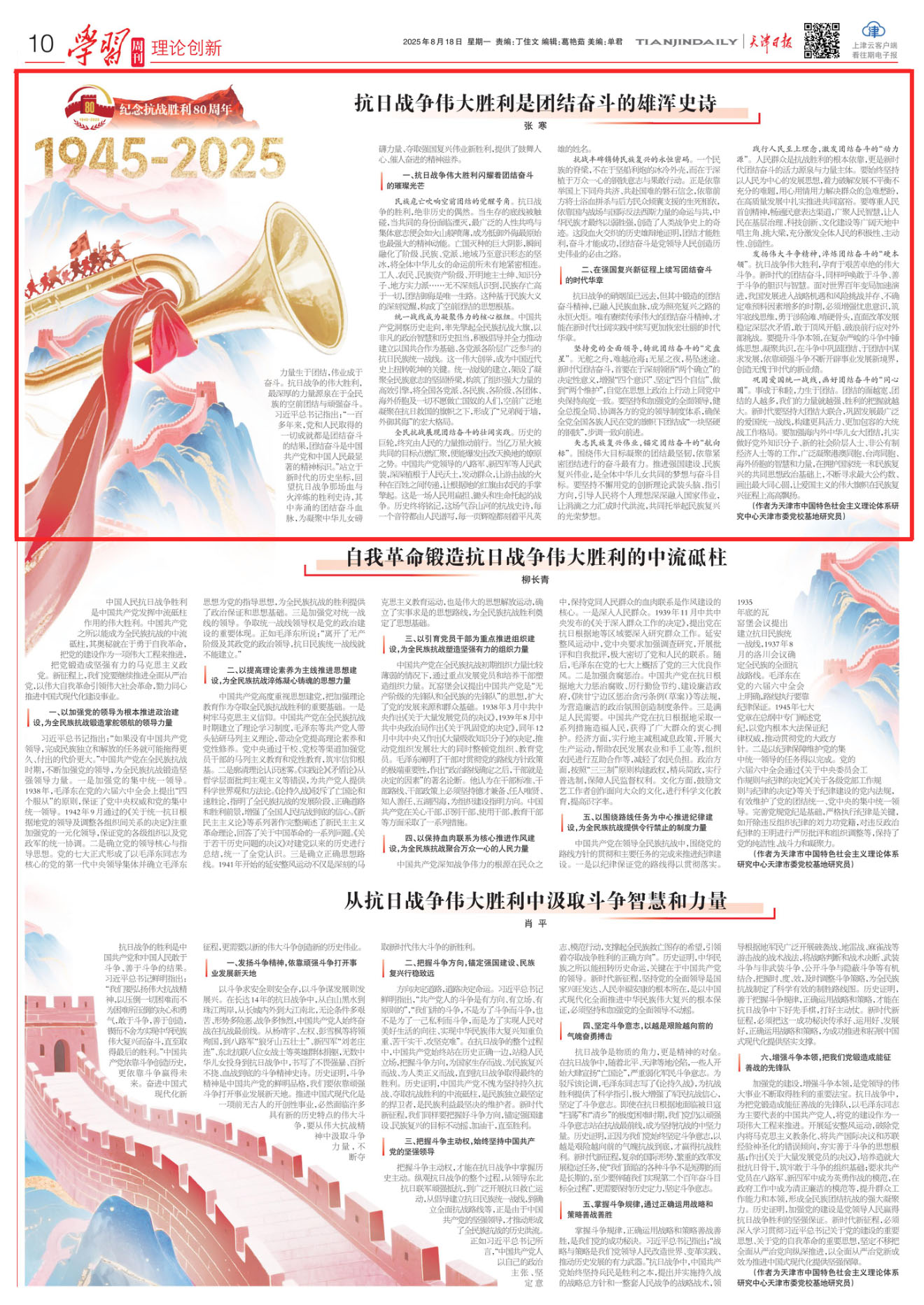 力量生于团结,伟业成于奋斗。抗日战争的伟大胜利,最深厚的力量源泉在于全民族的空前团结与顽强奋斗。习近平总书记指出:“一百多年来,党和人民取得的一切成就都是团结奋斗的结果,团结奋斗是中国共产党和中国人民最显著的精神标识。”站立于新时代的历史坐标,回望抗日战争那场血与火淬炼的胜利史诗,其中奔涌的团结奋斗血脉,为凝聚中华儿女磅礴力量、夺取强国复兴伟业新胜利,提供了鼓舞人心、催人奋进的精神滋养。