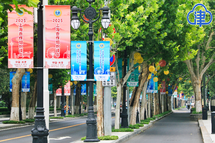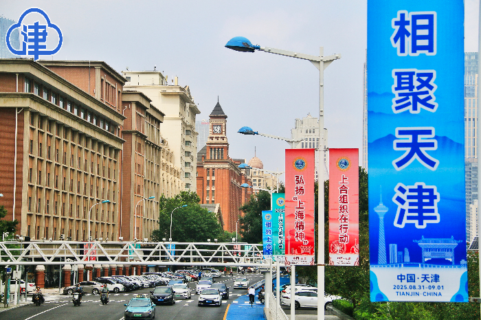 行至路上,周遭道旗阵列连绵不绝,形成壮观的视觉长廊。规格超两米的灯杆道旗整洁大方,以“天津欢迎您”“喜迎上合”等主题标语与城市地标交相辉映。记者从市容景观服务中心获悉,我市天桥横幅、广告牌体等立体装饰同步更新,南京路君隆广场、天津站后广场等点位,大型广告牌以多彩的画面传递峰会主题,成为城市景观的焦点。