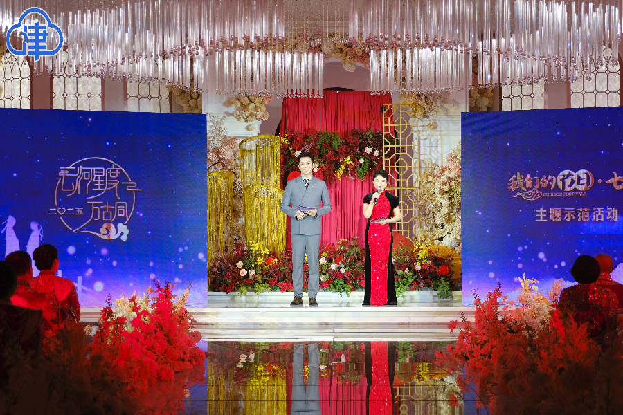 天津北方网讯:8月21日,由市文明办、海河传媒中心、北辰区委宣传部共同主办,北辰区文明办、天视文艺频道承办的“云河星度万古同——2025‘我们的节日·七夕’主题示范活动”,在北辰区墅外桃源婚礼主题公园举行。