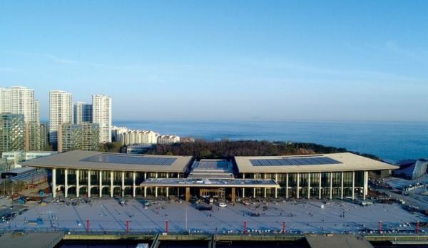 上合青岛峰会主会场外景(2018年5月18日摄)。新华社发(中建八局供图)