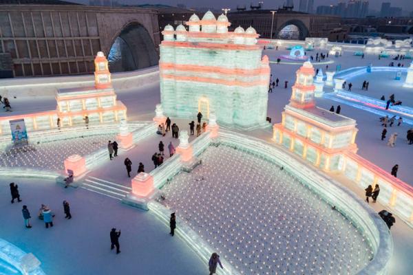 2023年2月1日,游客在哈尔滨冰雪大世界园区冰雪景观《胜利之城》周边游玩,该冰雪景观以印度的法塔赫布尔西格里城为原型设计建造(无人机照片)。此届哈尔滨冰雪大世界将上合组织成员国的特色建筑以冰雪景观的形式呈现。新华社记者 谢剑飞 摄