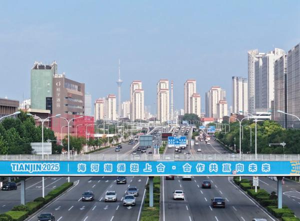 2025年8月5日拍摄的天津市西青区一过街天桥上的迎接上合组织天津峰会宣传标语(无人机照片)。新华社记者 李然 摄