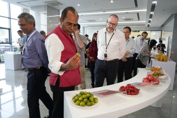 2025年5月19日,参加上海合作组织减贫和可持续发展论坛的嘉宾在陕西杨凌种业创新中心考察。新华社记者 邵瑞 摄