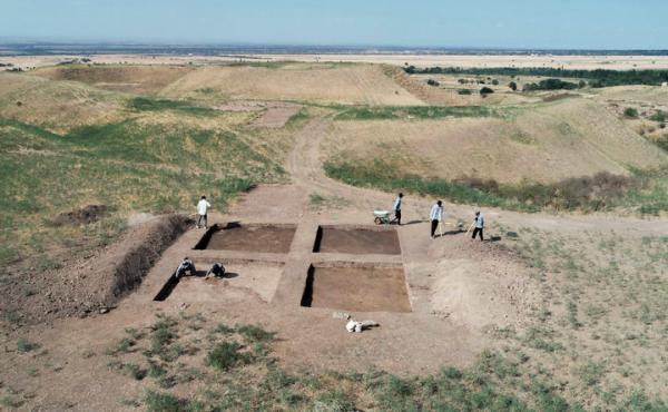 2023年8月9日,考古人员在中哈联合考古项目拉哈特遗址探方上工作(无人机照片)。新华社发(奥斯帕诺夫摄)