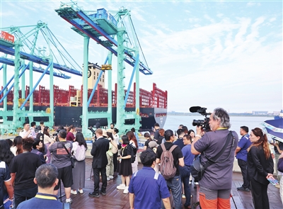 碧海蓝天间,人工智能运输机器人来往穿梭,自动化岸桥、场桥运转自如,整个作业区内看不到一名工作人员,却处处透露着科技与绿色、高效与有序,记者们纷纷举起手机、摄像机,记录下这现代化的码头作业场景。