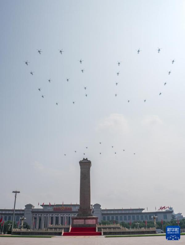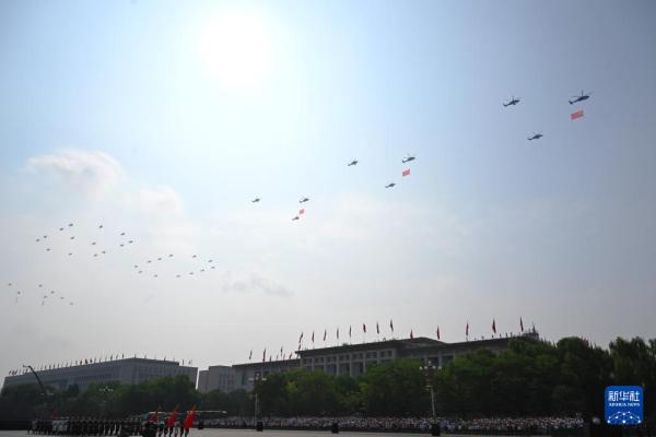 9月3日,纪念中国人民抗日战争暨世界反法西斯战争胜利80周年大会在北京隆重举行。这是空中护旗梯队通过天安门广场。