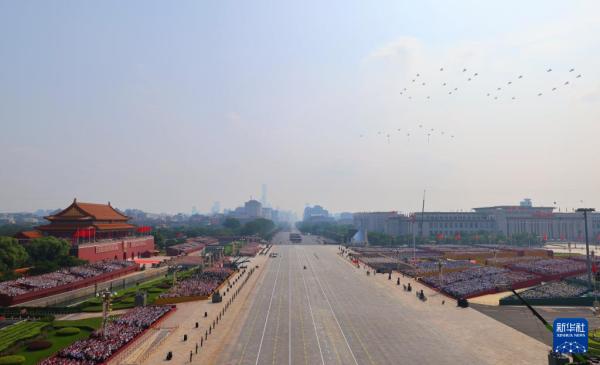 9月3日,纪念中国人民抗日战争暨世界反法西斯战争胜利80周年大会在北京隆重举行。这是空中护旗梯队飞过天安门广场上空。