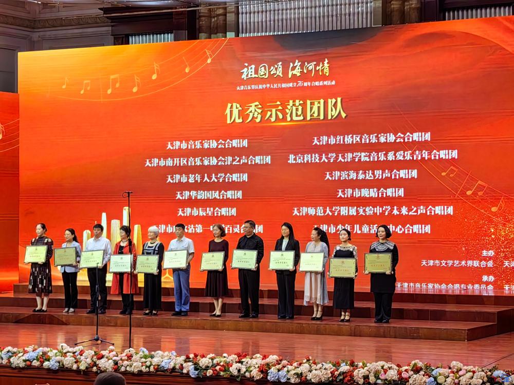 2025年,天津市音协带领合唱专委会和全市合唱团队,勠力同心,深耕舞台,在全国合唱舞台上大放光彩,取得25项国家级奖项,为天津争得了荣誉。为此,在开幕音乐会上,也对19支合唱队伍颁发了示范团队奖和突出贡献奖,对他们深耕合唱艺术、尽抒爱国情怀的有为之举给予肯定与激励。(津云新闻记者 吴宏)