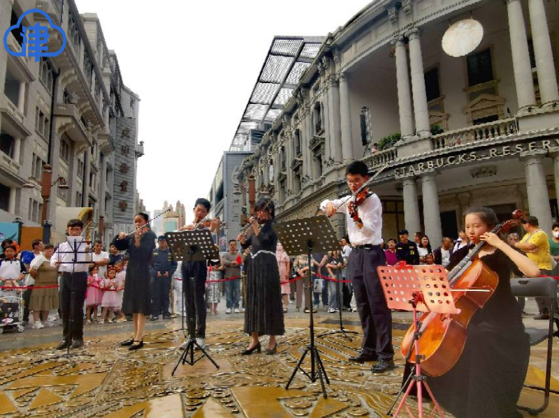汇文中学高一学生任佩霓从小学习小提琴,曾经登上过大大小小的舞台。像这样在街头,在市民中间演奏还是第一次。她说:“能和大家一起为祖国献歌,我感到非常激动。我也希望能让更多外地朋友了解天津,爱上天津。”