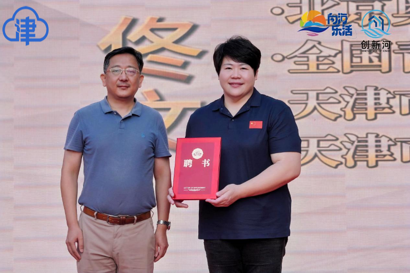 滨海新区区委常委、宣传部部长徐恒为奥运冠军佟文颁发“新河消费嘉年华活动推广大使”证书。佟文表示:“很高兴助力家乡盛会,希望带动更多人走进新河、体验新河魅力。”