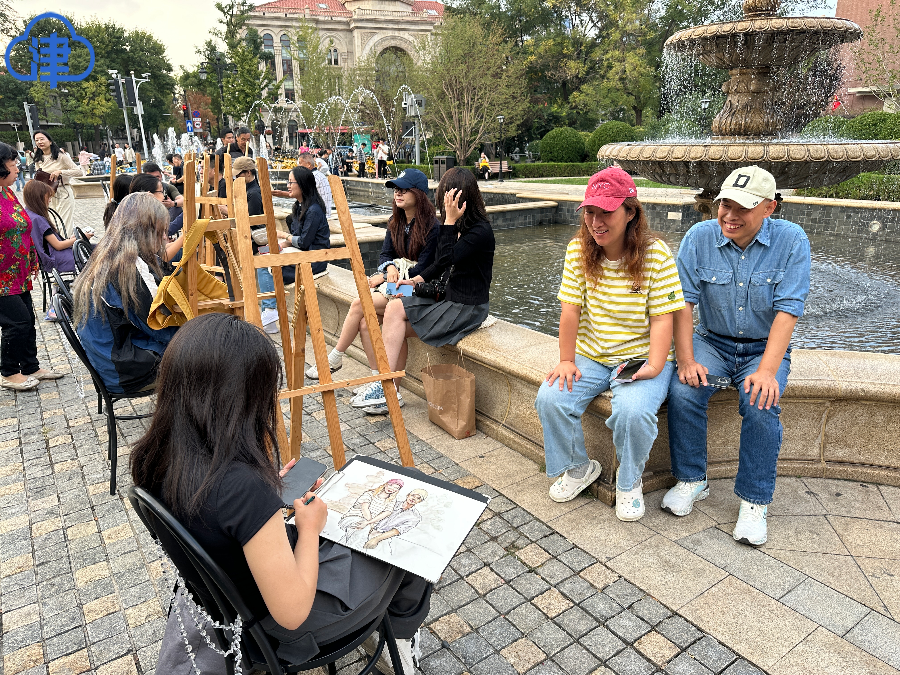 广场上,画架沿着喷泉池一字排开,来自天津美院的同学们以及南开大学艺术校友会的艺术家们挥动画笔,为市民勾勒肖像。或写实或卡通,一张张肖像将节日的欢喜定格在纸上。无论是家住附近的居民,还是远道而来的游客,都纷纷驻足在自己心仪的画师身边,或摆好造型,或轻声交流,耐心等待属于自己的这份“国庆特别纪念”。
