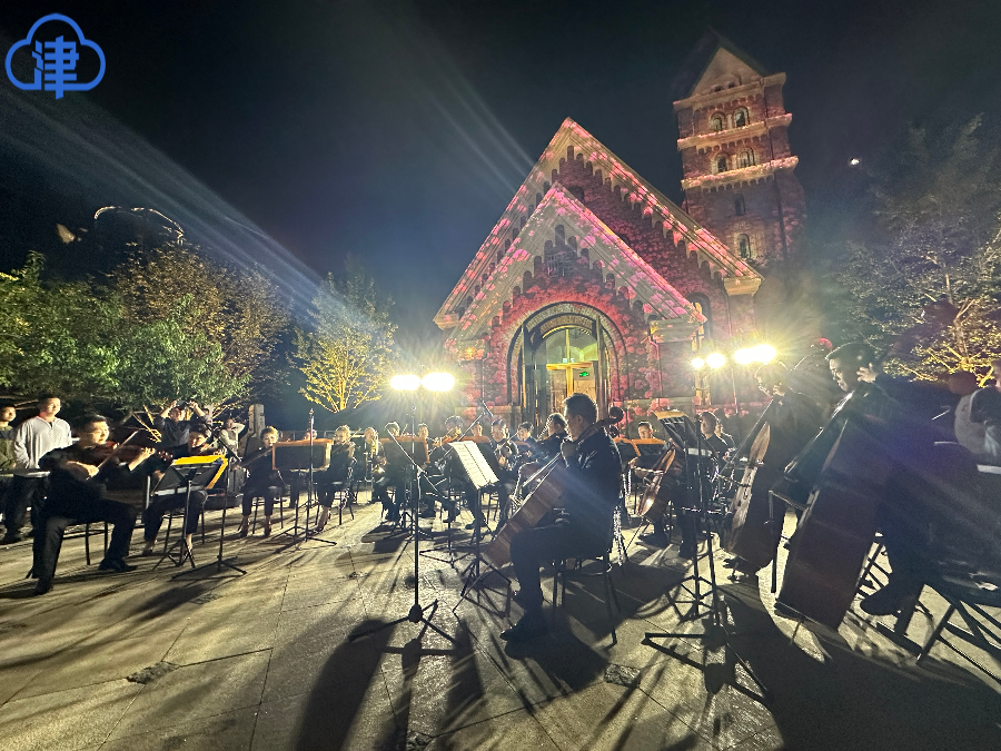傍晚时分,伴随着绚丽的灯光秀,天津交响乐团奏响户外公益音乐会。悠扬的旋律在广场回荡,观众三五成群、沉浸其中。一曲演奏完毕,人群中突然传出来小姑娘的声音:“还想听!”稚气未脱的话语也道出了在场观众共同的心声。灯光映照下,现场气氛温馨而热烈。