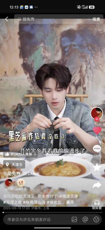 达人们以不同风格展现天津魅力,让“海河之夜”更有温度与深度。来自天津本土的明星胡先煦发布《逛吃逛吃的天津卫,您来就对了》视频,以津门游子之姿,携观众漫游天津,于欧式建筑间回溯工业往昔,在麻花炸糕里品味烟火温情,更邀人共赏海河夜色、天津之眼,解锁这座城的文艺与热忱,视频获得6.8万网友点赞。