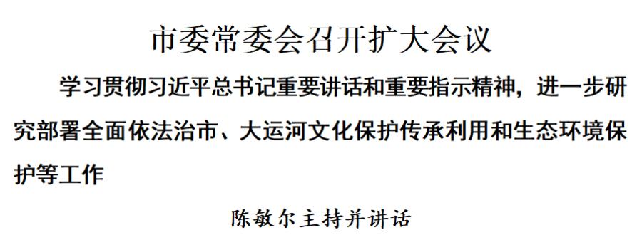 11月24日,市委常委会召开扩大会议,传达学习习近平总书记对全面依法治国工作作出的重要指示和中央全面依法治国工作会议精神,学习《习近平法治文选》第一卷和《习近平法治思想学习纲要(2025年版)》,学习习近平总书记关于大运河文化保护传承利用和生态环境保护的重要指示精神,听取我市大运河文化保护传承利用和生态环境保护工作情况汇报,研究部署有关工作。