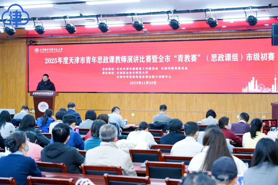 11月30日,由市教育两委主办的2025年度天津市青年思政课教师演讲比赛暨全市“青教赛”(思政课组)市级初赛在天津职业技术师范大学举办。来自全市25所高校的34名优秀青年思政课教师同台竞技、各展风采,集中展现了天津市思想政治理论课程建设的丰硕成果与青年教师队伍的过硬素质。